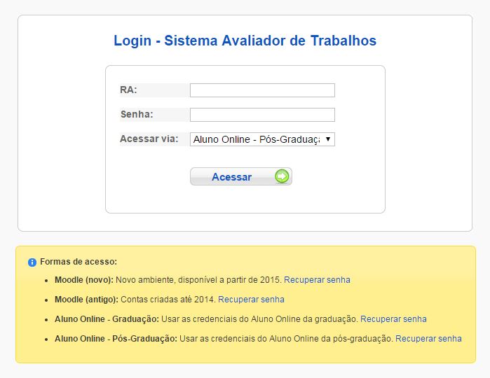 • Faça o login no sistema inserindo suas credenciais do Moodle ou Aluno Online.